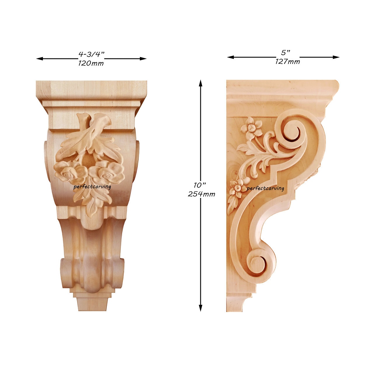 PAIR of Beautiful Rose Carved Wood Corbels, Shelf Brackets, Available in 10" & 14" High